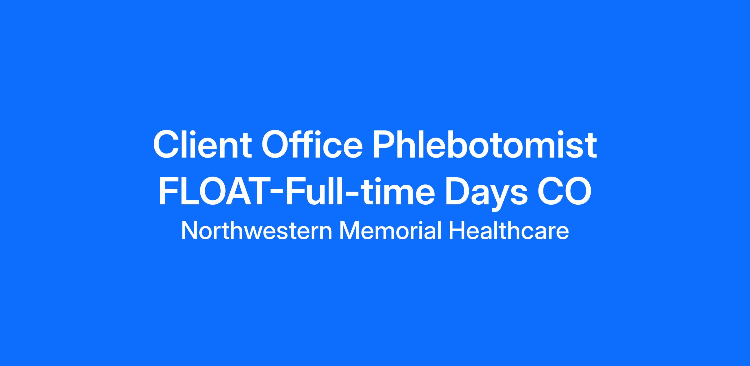 This is a full-time, 40 hours per week phlebotomy float position. Must be able to work Monday through Friday 8:30am to 5pm and two weekends per month. Flexibility with hours is needed for clients who may start earlier or stay later than the posted hours. Must be comfortable driving to client sites in the Buffalo Grove area and the surrounding suburbs. Base hourly rate includes float differential compensation.