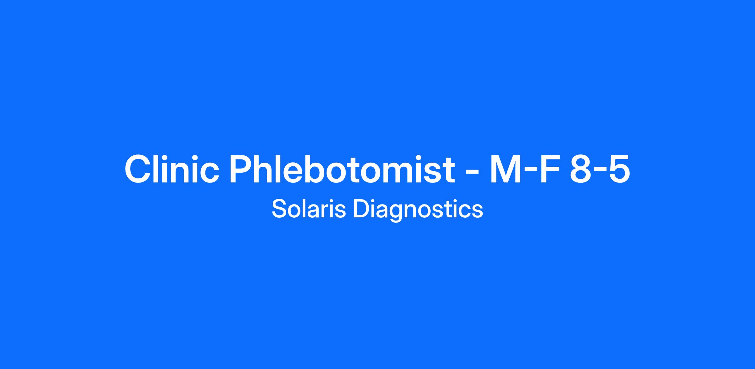 Solaris Diagnostics is seeking a reliable, skilled, and patient-focused In-Office Phlebotomist to join our clinical team. In this role, you’ll provide high-quality phlebotomy services directly within our clinic setting. You’ll perform accurate blood draws, maintain specimen integrity, and ensure every patient receives exceptional, compassionate care.