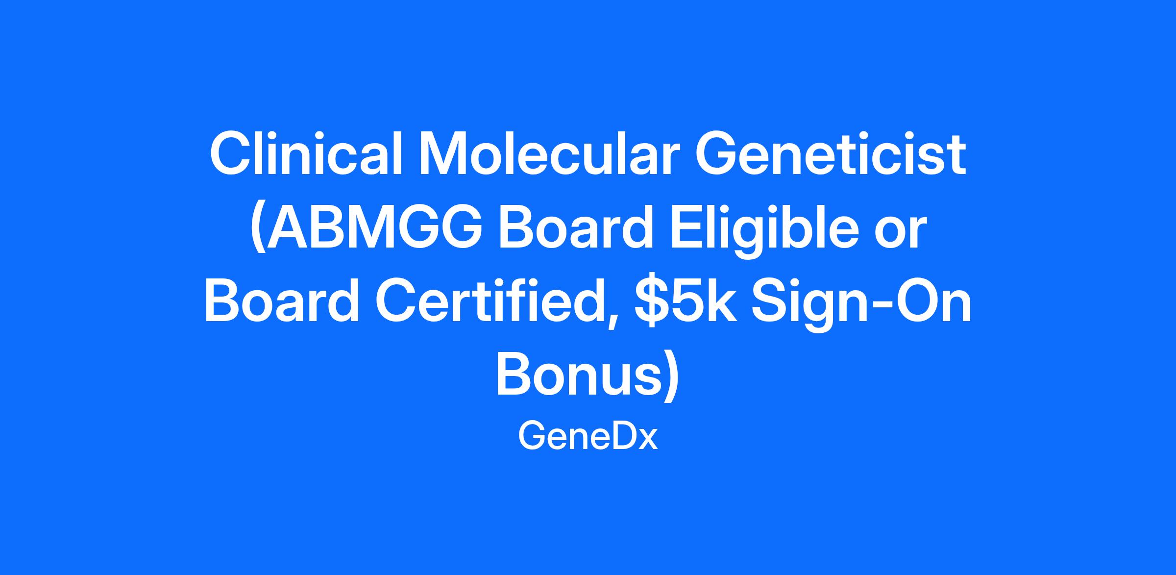 - ABMGG board certification or eligibility in Clinical Molecular Genetics and Genomics, Laboratory Genetics and Genomics, or Clinical Genetics and Genomics.