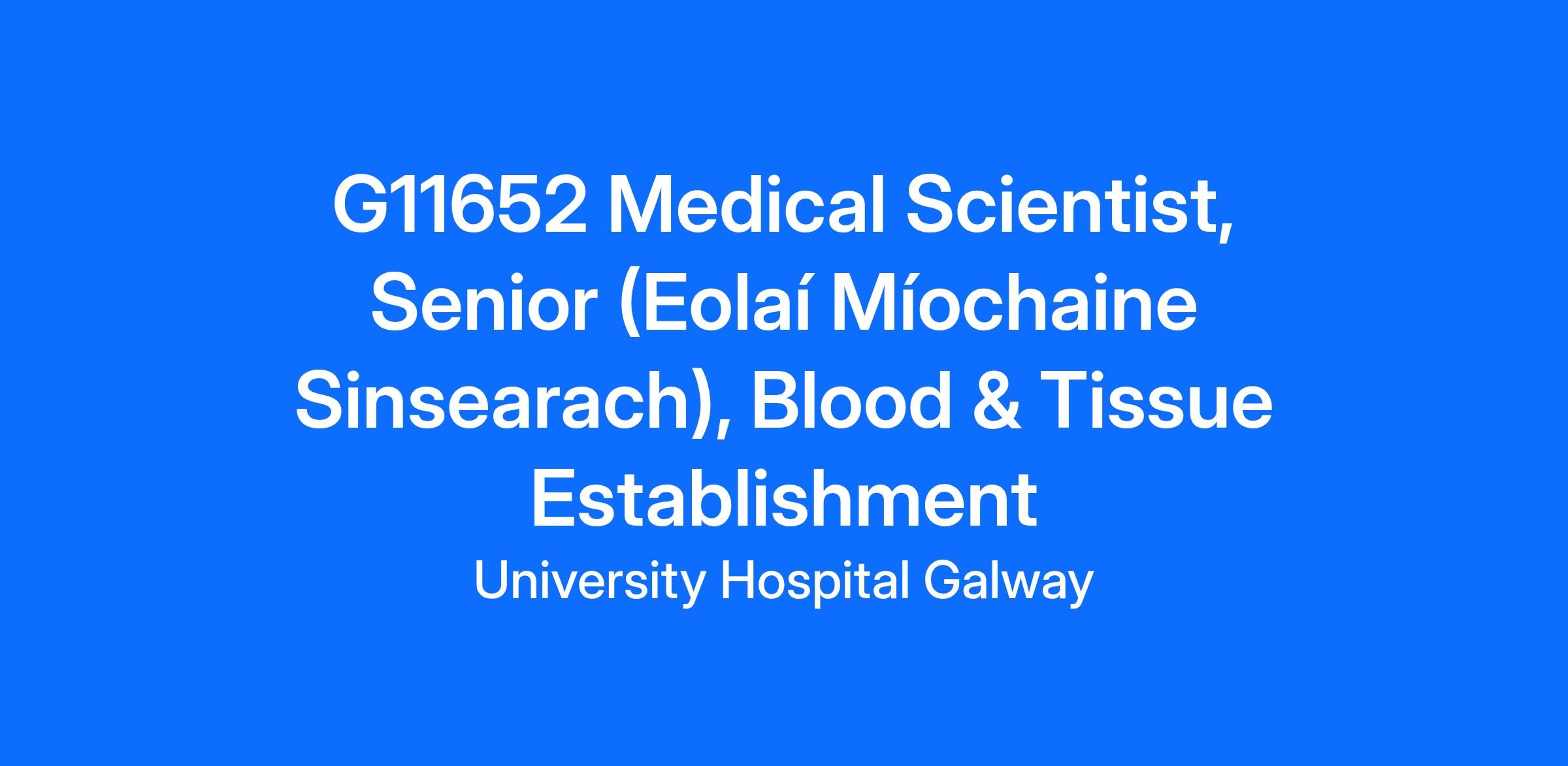 G11652 Medical Scientist, Senior (Eolaí Míochaine Sinsearach), Blood & Tissue Establishment, Galway University Hospitals