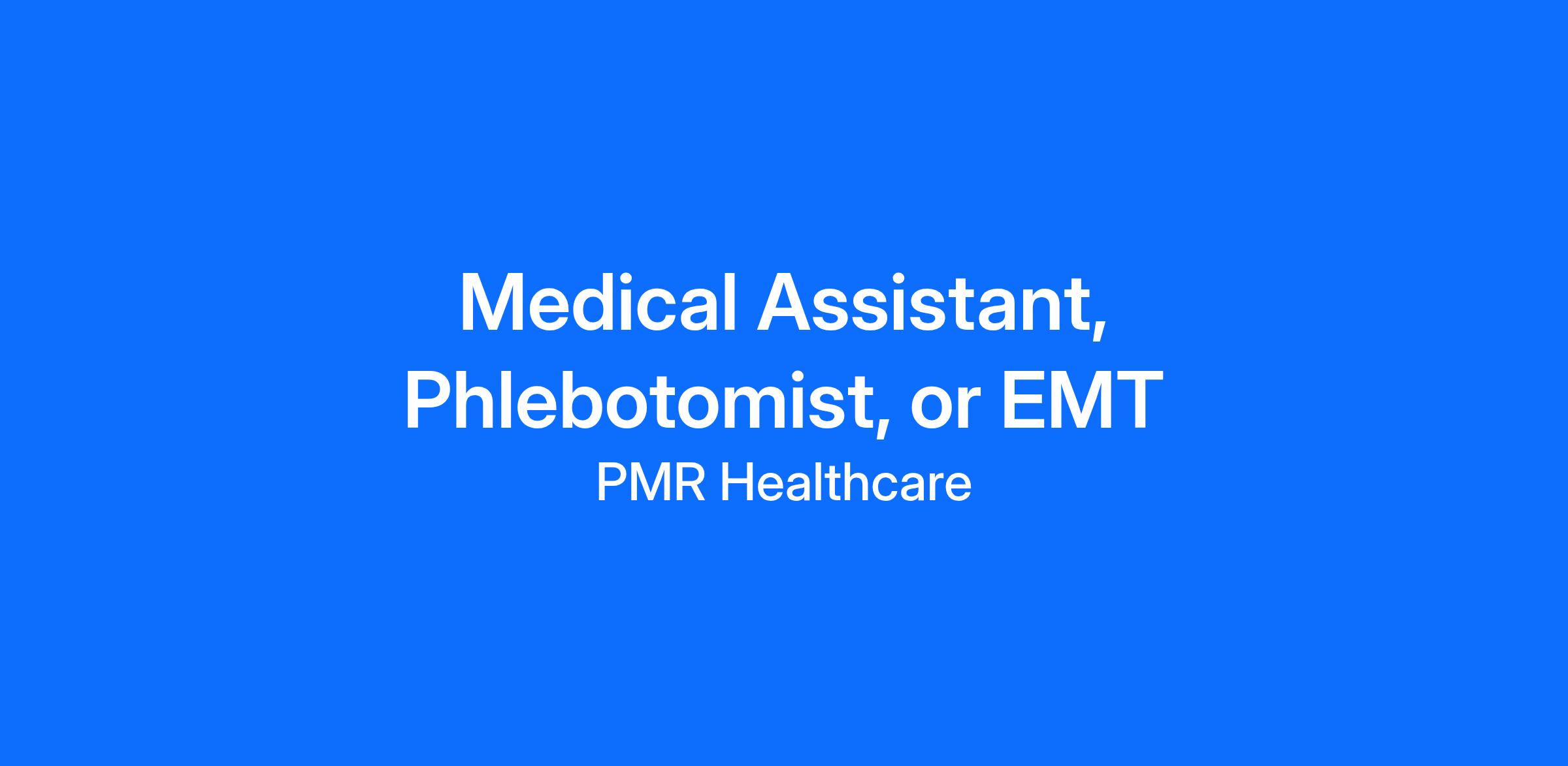 The private PMR Clinic that you will support in this position provides primary and occupational care to the employees and families of one of PMR's clients. The clinic is open Monday through Friday (no weekend shifts/rotations!) and closed on holidays. Medical assistants, phlebotomists, and EMT's are welcome to apply. Employees will receive all necessary site-specific training, ongoing support, and medical direction directly from PMR Healthcare.