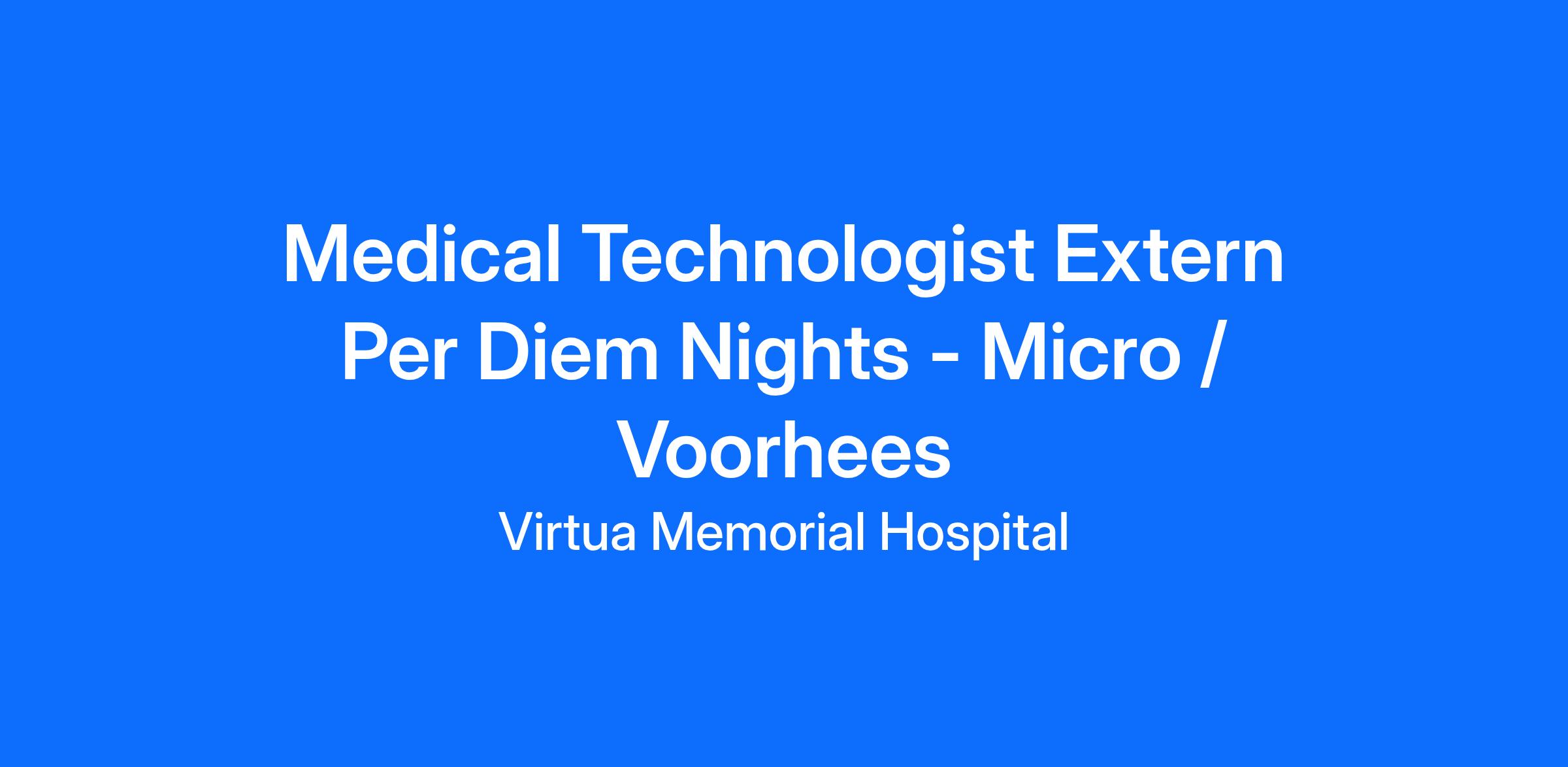 Under direct supervision, the extern participates in a three month rotation, in each applied clinical area to train, analyze, interpret, and validate Laboratory procedures of various complexities on biological material such as blood, body fluids, and tissues for Virtua customers. This role will interact consistently with the department manager, supervisor, lead tech, and staff.