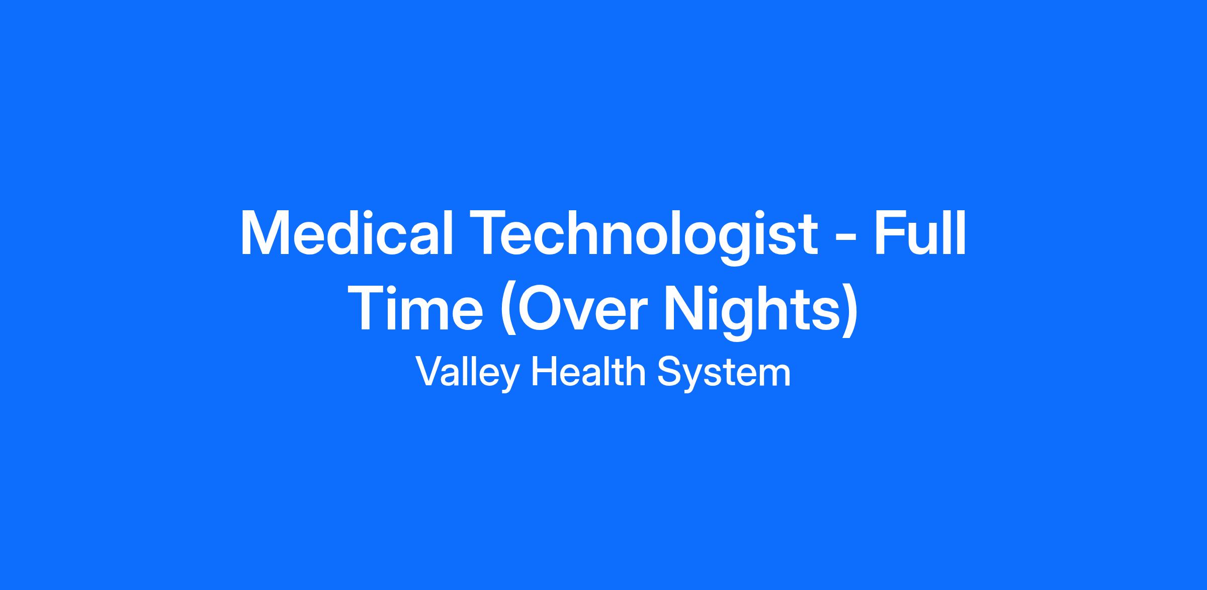 18 months of hospital laboratory experience required with six of the months in full-time equivalent general medical technology position within a Valley Health facility required.
