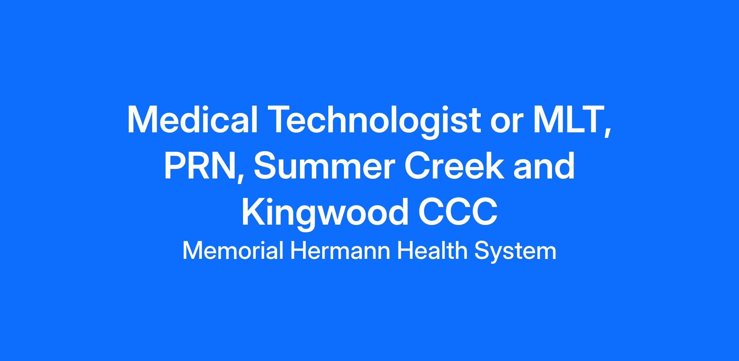 Memorial Hermann seeks a supplemental MT or MLT to join our Summer Creek and Kingwood Convenient Care Centers.Minimum Qualifications