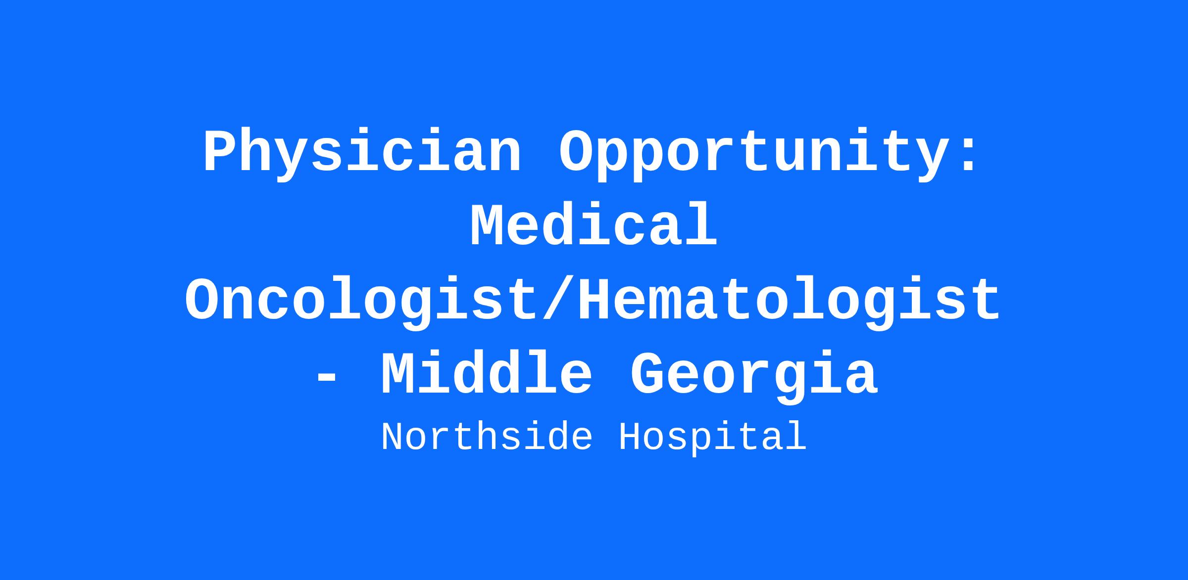 Northside Hospital is seeking a Medical Oncologist/Hematologist to join our team in Middle Georgia. These opportunities are located in the heart of Georgia in Macon, Milledgeville and Hawkinsville.
