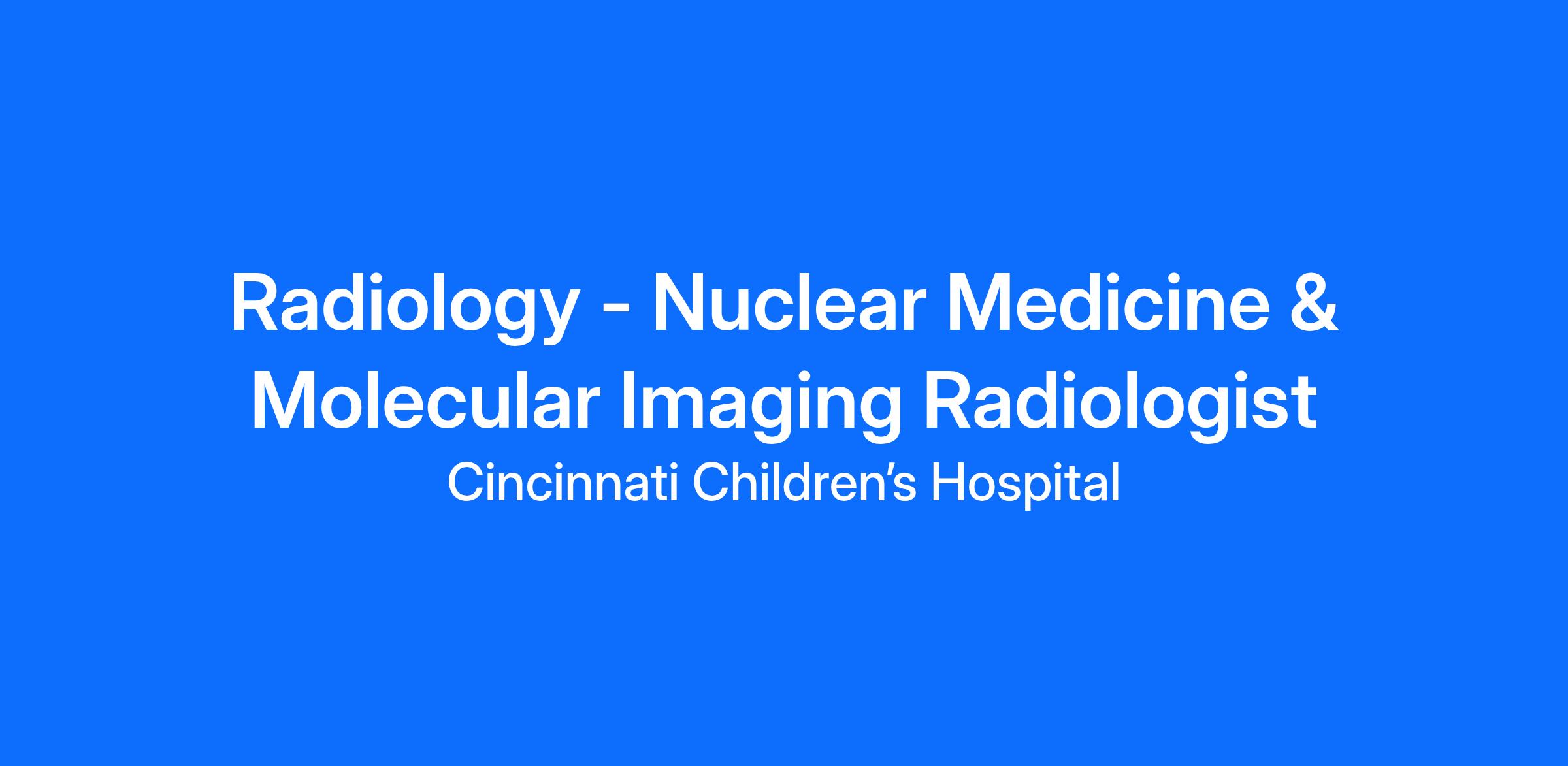 The Department of Radiology at Cincinnati Children’s Hospital Medical Center is seeking an ABR or AOBR certified or eligible radiologist with fellowship-level training in nuclear medicine and molecular imaging to join our faculty. The department performs a full array of diagnostic nuclear medicine procedures, including over 700 PET scans per year. As the only pediatric SNMMI Comprehensive Radiopharmaceutical Therapy Center of Excellence, we perform more therapies than any other pediatric center in the USA. With a newly opened cyclotron facility adjacent to our campus, one of the top pediatric oncology programs in the country, and a strong clinical research infrastructure we are poised to make further advances in pediatric imaging and theranostics.