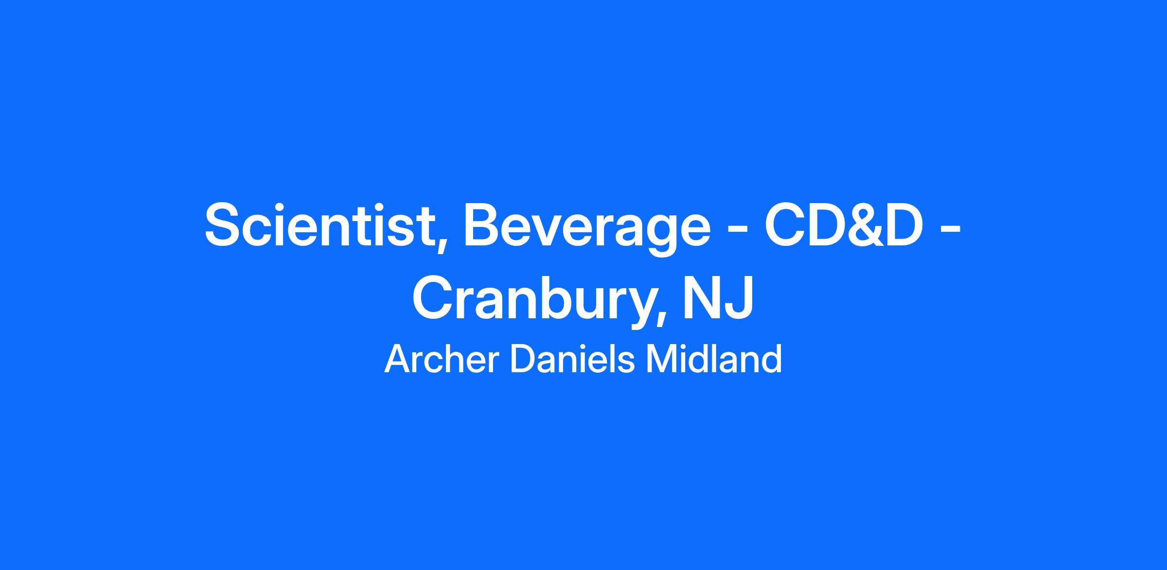 CD&D Beverage Scientist – Cranbury NJMAIN FUNCTION:Individual will be responsible for formulation and processing of beverage solutions highlighting the company portfolio. Position involves a high level of collaboration with customers and ADM colleagues. The role requires an ability to characterize new and existing ingredients to identify optimal solutions for formulation challenges. A working aptitude in beverage manufacturing processes is also a requirement for this position. The successful candidate will be able to demonstrate experience in formulation methods and ingredient functionality along with an ability to create quality products for customer evaluation. This position will work with ADM’s leadership, food science & technology, business and product development team members to address business opportunities aligned with the growth strategy. The successful candidate will have strong presentation skills, be self-motivated, agile and team oriented. Prior experience with product development is required. Knowledge of beverage and food regulations and labeling is strongly preferred. This position will be based in ADM’s Cranbury, NJ location. Individual will be required to travel to other ADM North American sites and customers for project and scale-up work.